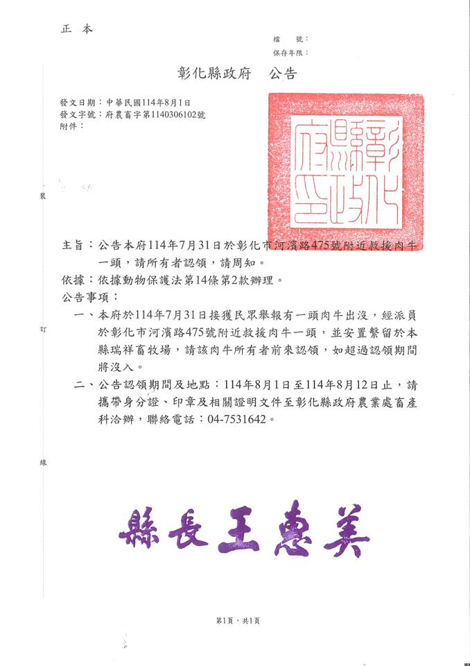 最新公告 有關彰化縣政府114年7月31日於彰化市河濱路475號附近救援肉 牛一頭,因無民眾領回,開放民眾認養一案 歷史訊息 | 發布日期: 2025/08/19~2025/08/25 | 瀏覽人數: 51人 | 聯絡資訊: 農經課祁小姐 04-8347171#157 詳情請參閱附圖~