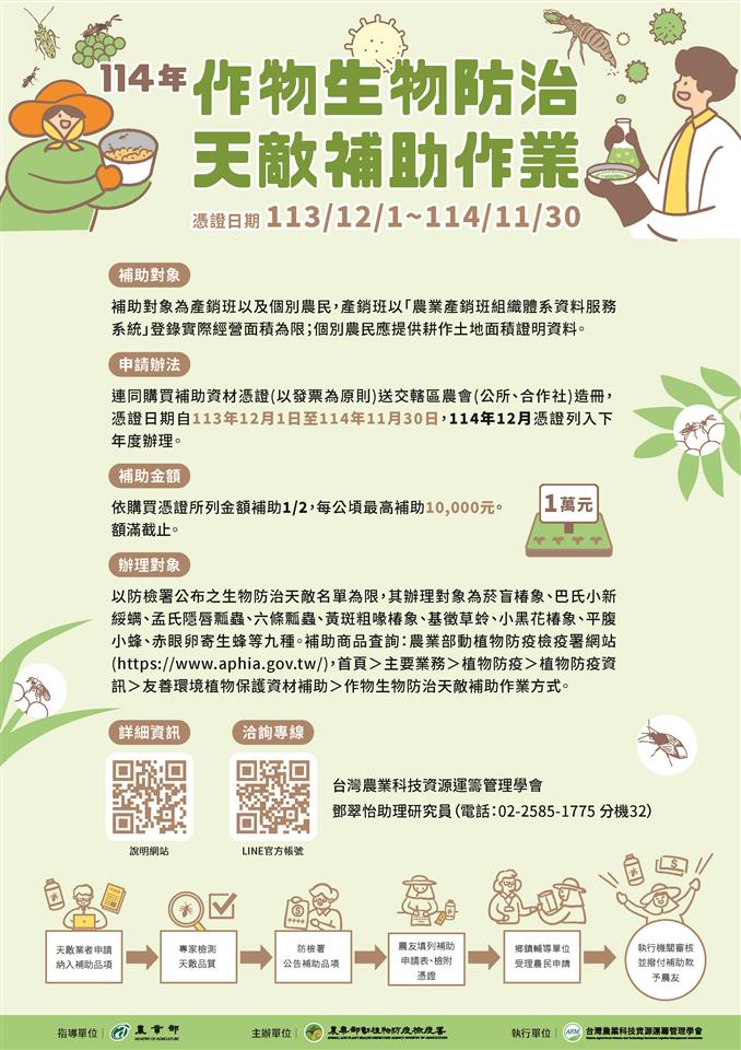 最新公告 【轉知】農業部動植物防疫檢疫署「114年度作物生物防治天敵補助作業」將於114年12月5日截止,敬請有需求農民踴躍申請 發布日期: 2025/10/02~2025/12/08 | 瀏覽人數: 23人 | 聯絡資訊: 農經課陳先生 04-8347171#154 一、為推動化學農藥風險減量政策及友善環境農業,農業部動植物防疫檢疫署自111年起辦理「作物生物防治天敵補助作業」,鼓勵農友使用生物防治天敵。凡符合資格之補助對象,得申請「114年作物生物防治天敵補助」,有關規定詳如附件「補助作業宣傳單張」。二、補助對象:個別農民或產銷班(需提供統一編號編配通知書及完整班員名單)皆可向所屬轄區之鄉鎮輔導單位申請。三、受理日期:即日起至114年12月5日。四、申請與受理方式:申請者檢附購買憑證正本、領據正本、身份證影本、存摺封面影本、耕作面積證明資料影本,向轄區鄉鎮輔導單位(相關縣市之鄉、鎮、市、區公所、農會、合作社場、協會等)申請造冊。五、憑證日期:113年12月1日至114年11月30日。六、補助金額:依購買憑證所列金額補助1/2,每公頃最高補助1萬元。申請者需檢附耕作面積證明資料。