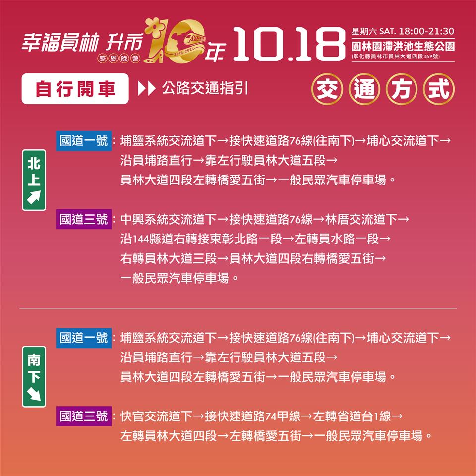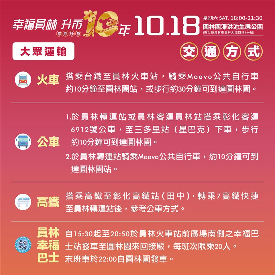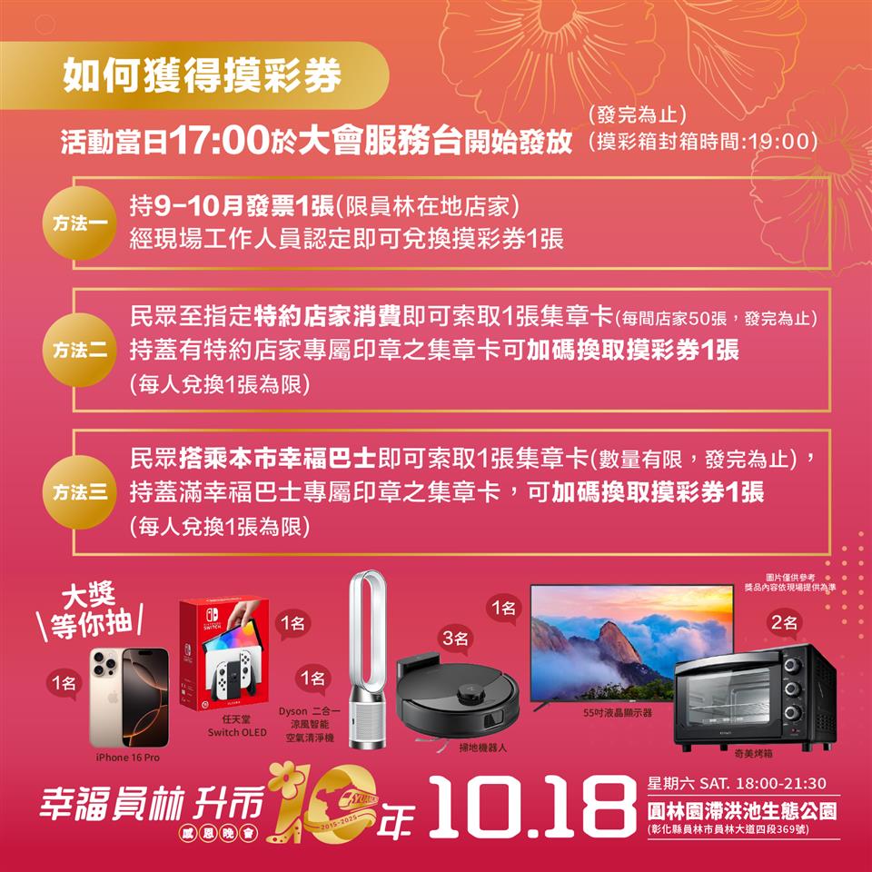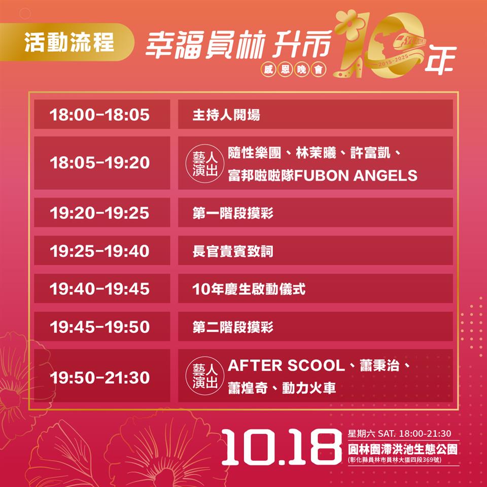 最新公告 🎉幸福員林-升市十年~感恩晚會🎉系列活動 發布日期: 2025/10/16~2025/10/19 | 瀏覽人數: 13人 | 聯絡資訊: 觀光發展課陳小姐 04-8347171#174 「幸福員林.升市十年」 感恩晚會10/18(六)晚間6點|圓林園滯洪池生態公園🔥卡司超強陣容🔥#動力火車 #蕭煌奇 #蕭秉治 #AfterScool #許富凱 #林茉曦#Random隨性樂團 #富邦啦啦隊 #FubonAngels摸彩抽iPhone、Switch、50吋電視!卡司上台時間、交通指引、摸彩規則,這裡看!(附件連結)