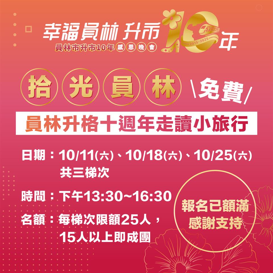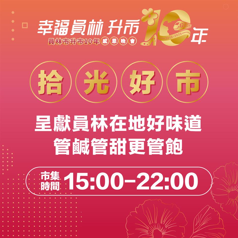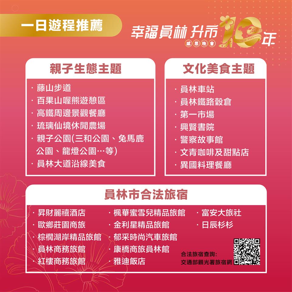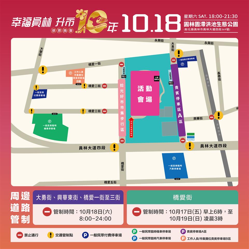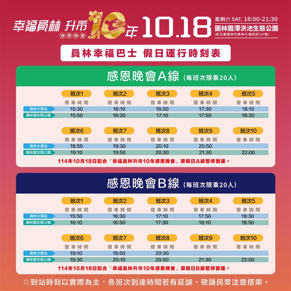 最新公告 🎉幸福員林-升市十年~感恩晚會🎉系列活動 發布日期: 2025/10/16~2025/10/19 | 瀏覽人數: 13人 | 聯絡資訊: 觀光發展課陳小姐 04-8347171#174 「幸福員林.升市十年」 感恩晚會10/18(六)晚間6點|圓林園滯洪池生態公園🔥卡司超強陣容🔥#動力火車 #蕭煌奇 #蕭秉治 #AfterScool #許富凱 #林茉曦#Random隨性樂團 #富邦啦啦隊 #FubonAngels摸彩抽iPhone、Switch、50吋電視!卡司上台時間、交通指引、摸彩規則,這裡看!(附件連結)