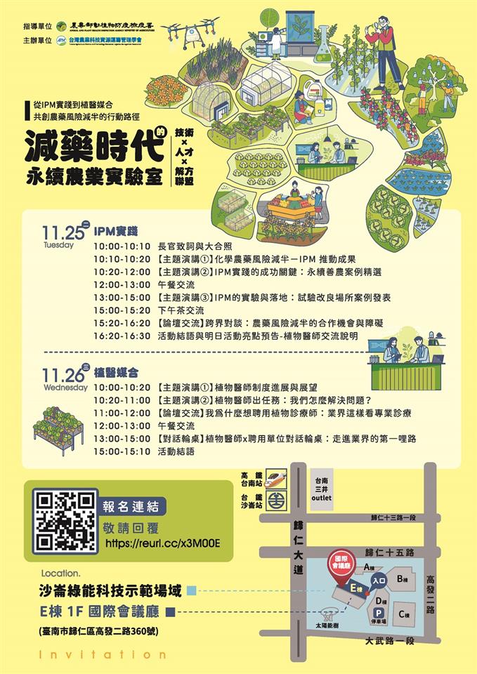 最新公告 【轉知】114年度「作物有害生物綜合管理IPM成果發表會」謹訂於本(114)年11月25日至11月26日辦理,敬邀農友及有關人員踴躍報名 發布日期: 2025/11/05~2025/12/05 | 瀏覽人數: 25人 | 聯絡資訊: 農經課陳先生 04-8347171#154 1.依據社團法人台灣農業科技資源運籌管理學會114年11月3日台農科(管)字第1141103494號函辦理。2.活動時間:114年11月25日(星期二)上午10時(9時30分開放報到)、11月26日(星期三)上午10時(9時30分開放報到)。3.活動地點:沙崙綠能科技示範場域E棟1樓國際會議廳(臺南市歸仁區高發二路360號)。4.敬請於11月14日(星期五)前完成報名,報名網址:https://reurl.cc/6b23xr,前100名完成報名者贈送友善農產品。5.如有任何問題請聯繫本學會張毓庭研究專員(電話:02-25851775分機66、E-mail:ytchangg.tarm@gmail.com);鄧翠怡助理研究員(電話:02-25851775分機32、E-mail:cytang.tarm@gmail.com)。