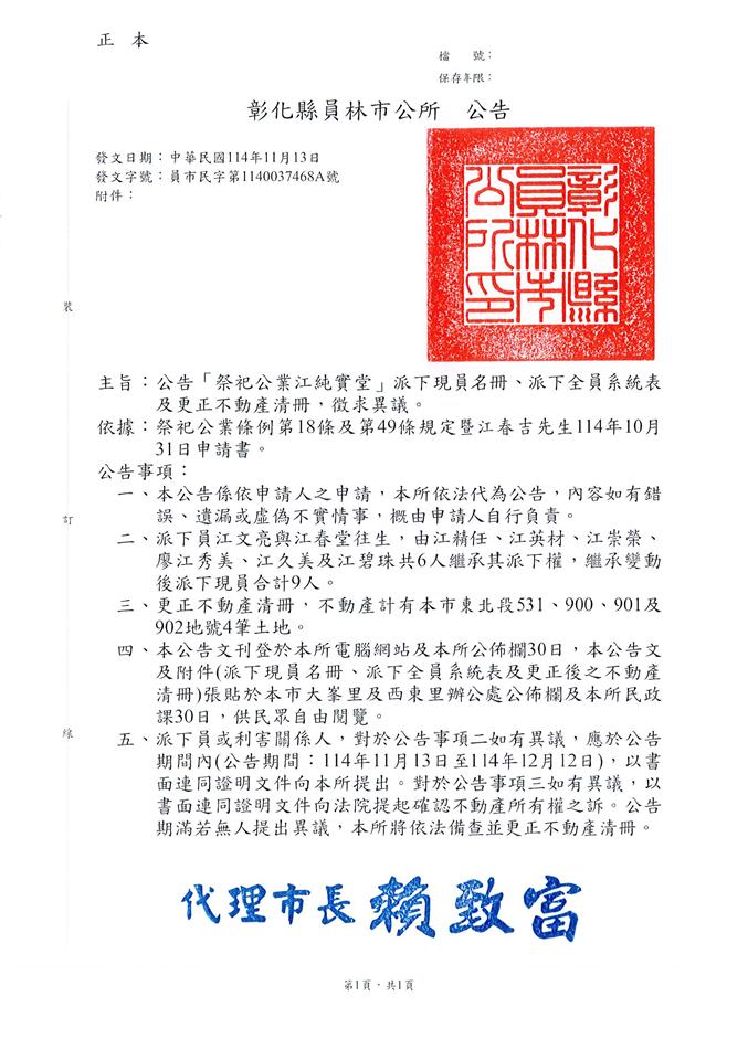 最新公告 公告「祭祀公業江純實堂」派下現員名冊、派下全員系統表及更正不動產清冊,徵求異議。 發布日期: 2025/11/13~2025/12/15 | 瀏覽人數: 34人 | 聯絡資訊: 民政課林小姐 04-8347171#501 依據:祭祀公業條例第18條及第49條規定暨江春吉先生114年10月31日申請書。公告事項:1、本公告係依申請人之申請,本所依法代為公告,內容如有錯誤、遺漏或虛偽不實情事,概由申請人自行負責。2、派下員江文亮與江春堂往生,由江精任、江英材、江崇榮、廖江秀美、江久美及江碧珠共6人繼承其派下權,繼承變動後派下現員合計9人。3、更正不動產清冊,不動產計有本市東北段531、900、901及902地號4筆土地。4、本公告文刊登於本所電腦網站及本所公佈欄30日,本公告文及附件(派下現員名冊、派下全員系統表及更正後之不動產清冊)張貼於本市大峯里及西東里辦公處公佈欄及本所民政課30日,供民眾自由閱覽。5、派下員或利害關係人,對於公告事項二如有異議,應於公告期間內(公告期間:114年11月13日至114年12月12日),以書面連同證明文件向本所提出。對於公告事項三如有異議,以書面連同證明文件向法院提起確認不動產所有權之訴。公告期滿若無人提出異議,本所將依法備查並更正不動產清冊。