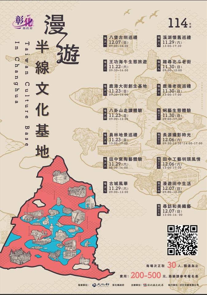 藝文資訊 【轉知】彰化縣文化局辦理「114年度漫遊半線文化基地之走讀活動及培訓課程」 發布日期: 2025/11/17~2025/12/08 | 瀏覽人數: 25人 | 聯絡資訊: 觀光發展課陳小姐 04-8347171#174 詳情請參閱附件~