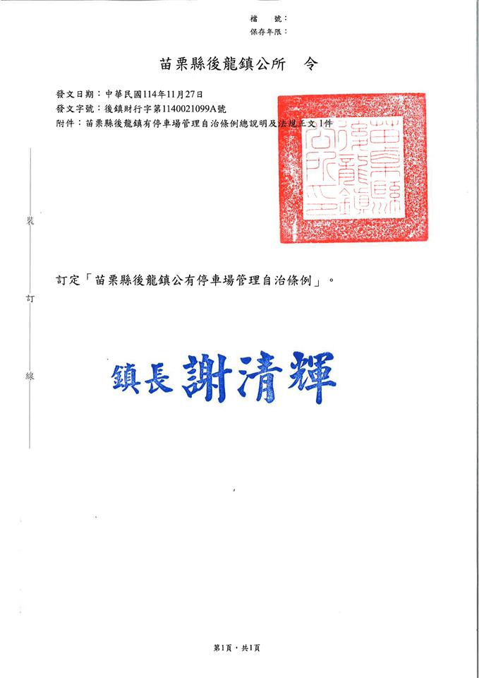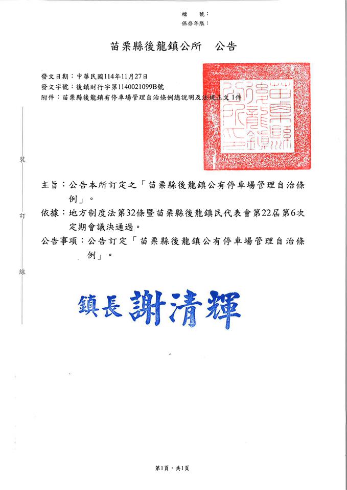 他縣公告 【轉知】「苗栗縣後龍鎮公有停車場管理自治條例」公告 發布日期: 2025/12/03~2026/01/03 | 瀏覽人數: 42人 | 聯絡資訊: 農經課陳先生 04-8347171#154 詳情請參閱附圖~