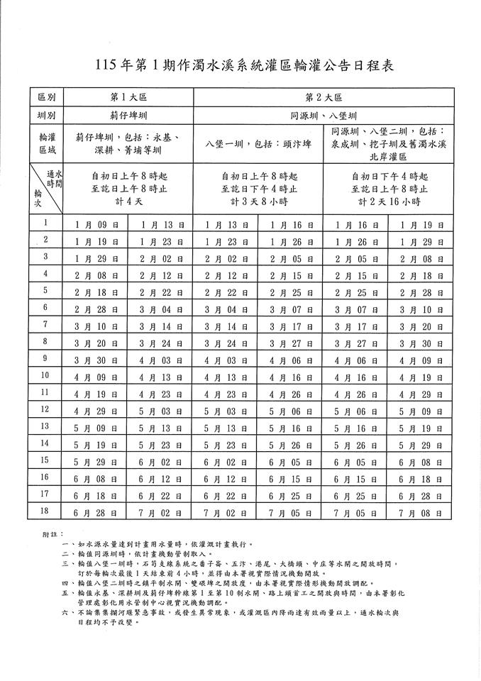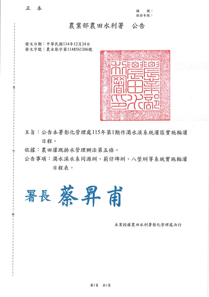 最新公告 【轉知】農業部農田水利署彰化管理處115年第1期作濁水溪系統實施輪灌公告及日程表 發布日期: 2025/12/29~2026/07/31 | 瀏覽人數: 32人 | 聯絡資訊: 農經課陳先生 04-8347171#154 詳情請參閱附件~