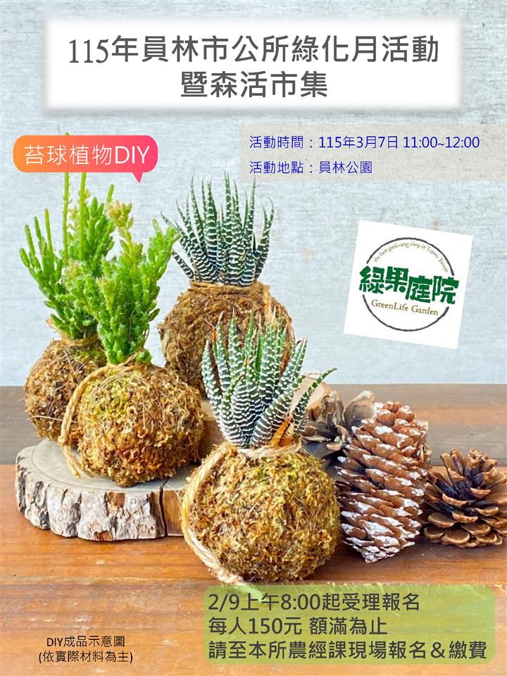 最新公告 🌱115年員林市公所綠化月活動暨森活市集-苔球植物DIY報名資訊 發布日期: 2026/01/26~2026/03/07 | 瀏覽人數: 23人 | 聯絡資訊: 農經課祁小姐 04-8347171#157 🌱115年員林市公所綠化月活動暨森活市集-苔球植物DIY報名資訊🍀報名時間:115年2月9日上午8:00起開始受理報名,每人150元額滿為止,請至本所農經課現場報名&繳費。🍀活動時間:115年3月7日上午11:00~12:00🍀活動地點:員林公園
