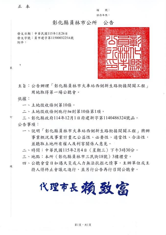 最新公告 【公告】公告辦理「彰化縣員林市火車站西側新生路銜接開闢工程」用地取得第一場公聽會 發布日期: 2026/01/26~2026/02/06 | 瀏覽人數: 23人 | 聯絡資訊: 建設課張先生 04-8347171#518 詳情請參閱附件