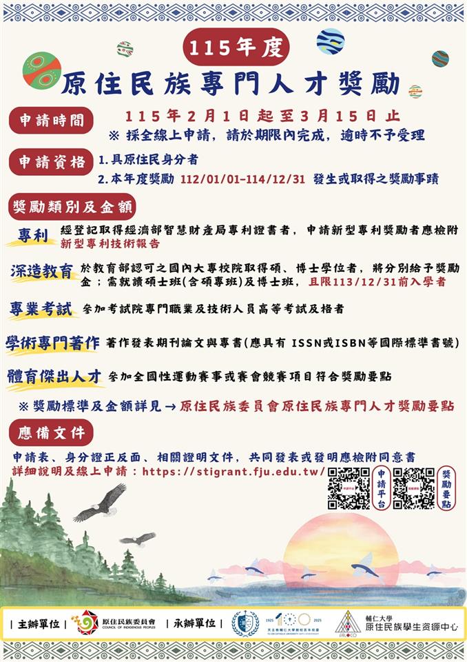 最新公告 【轉知】原住民族委員會辦理「115年度原住民族專門人才頒獎典禮暨獎勵金核發工作計畫」 發布日期: 2026/01/28~2026/03/16 | 瀏覽人數: 16人 | 聯絡資訊: 民政課黃先生 04-8347171#503 詳情請參閱附件~