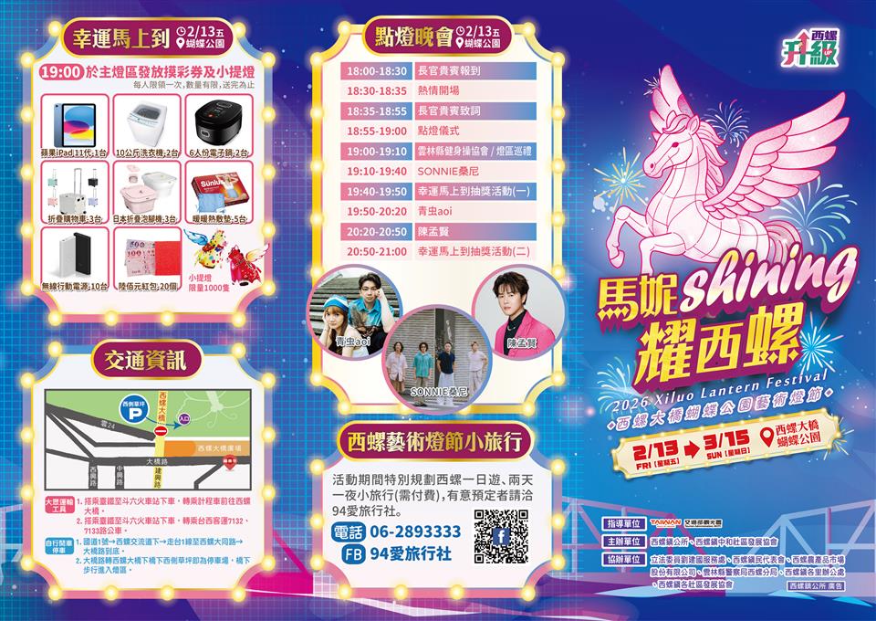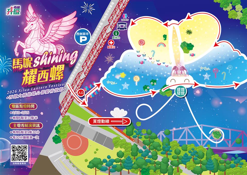 他縣公告 【轉知】雲林縣西螺鎮公所辦理「2026西螺大橋蝴蝶公園藝術燈節」活動 發布日期: 2026/02/10~2026/03/15 | 瀏覽人數: 28人 | 聯絡資訊: 觀光發展課游小姐 04-8347171#176 詳情請參閱附件~