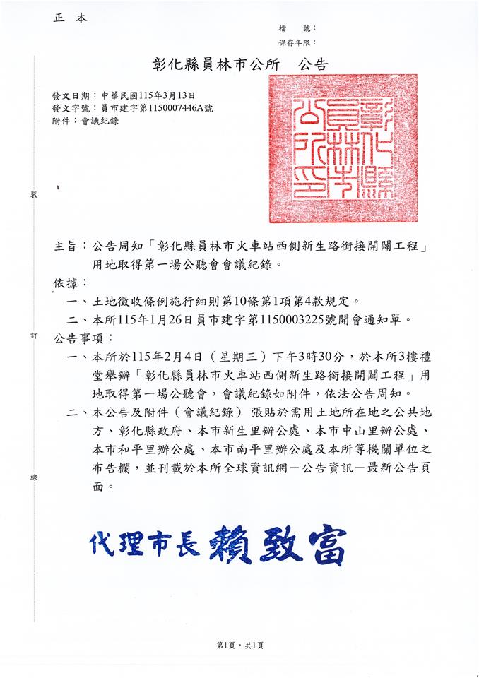 最新公告 公告周知「彰化縣員林市火車站西側新生路銜接開闢工程」 用地取得第一次公聽會會議紀錄 發布日期: 2026/03/16~2026/04/16 | 瀏覽人數: 55人 | 聯絡資訊: 建設課張先生 04-8347171#518 詳情請參閱附件~