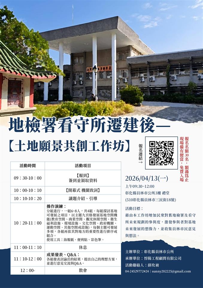 最新公告 【公告】員林市公所辦理「地檢署看守所遷建後-土地願景共創工作坊」 發布日期: 2026/04/01~2026/04/13 | 瀏覽人數: 7人 | 聯絡資訊: 建設課徐先生 04-8347171#511 詳情請參閱附件~