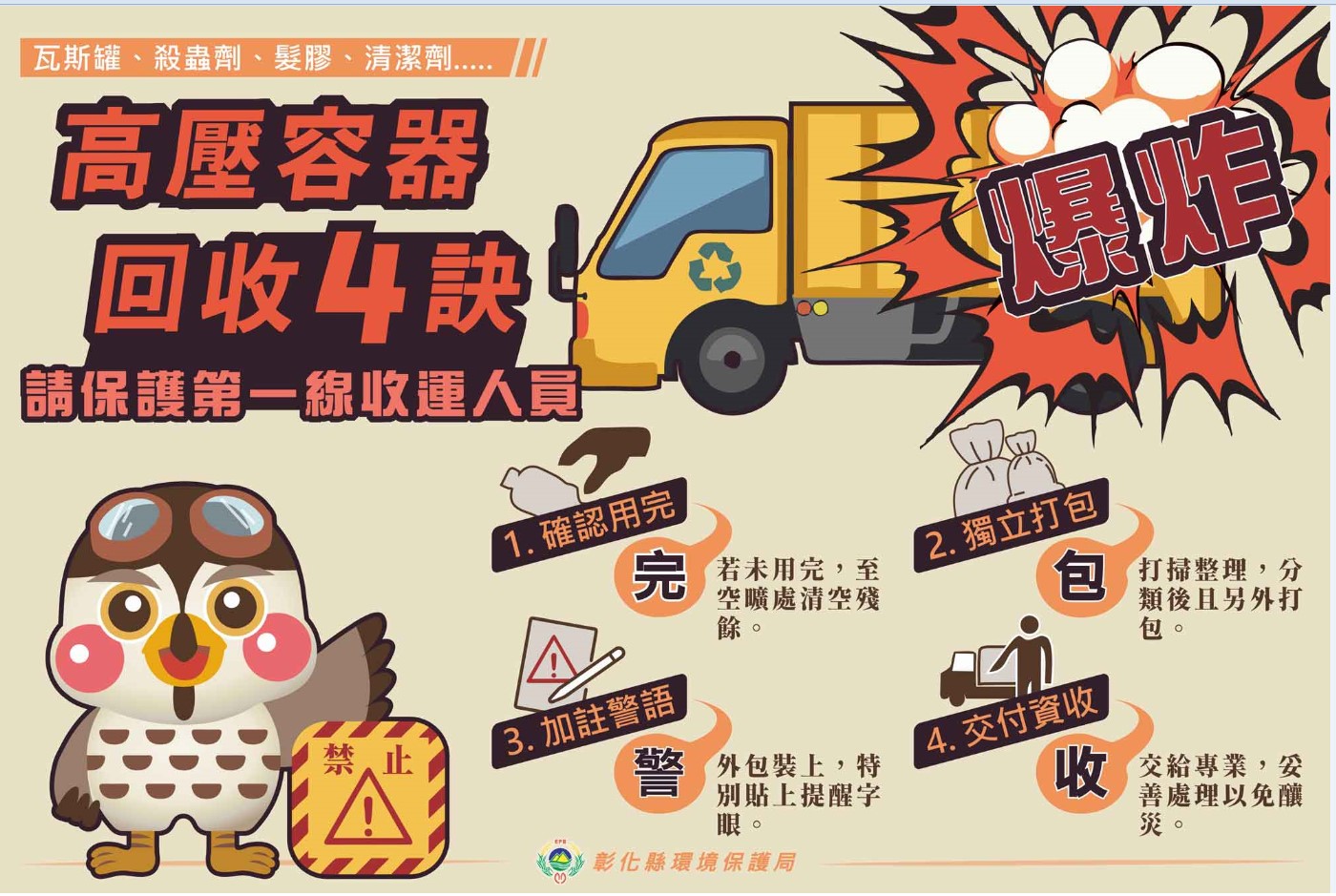 其他資訊 高壓氣瓶回收宣導 發布日期: 2026/01/05~2026/02/05 | 瀏覽人數: 7人 | 聯絡資訊: 詹惠如 8972001分機175 高壓氣瓶回收需要遵循「完、包、警、收」四步驟:確認用盡(到空曠處排空內容物,不可打洞)、獨立打包、加註「內有高壓瓶」警語,最後交給資源回收車,切勿丟入一般垃圾車,以免因擠壓摩擦引發爆炸,危及生命安全。常見的高壓瓶如瓦斯罐、髮膠、殺蟲劑、噴漆等都適用此規則。 高壓氣瓶回收「4步驟」 完 (確認用盡): 在空曠處,朝逆風方向,按壓噴嘴將內容物完全噴出。 嚴禁自行戳洞、敲打、壓扁或火燒,容易爆炸。 包 (獨立打包): 將排空後的瓶罐單獨裝袋,不要與其他回收物混裝。 警 (加註警語): 在包裝上明顯處,寫上「內有高壓瓶」的警示字樣。 收 (交付資收): 交給資源回收車,並提醒清潔隊員有高壓瓶,不可丟入一般垃圾車。 應回收的常見高壓容器 瓦斯罐(卡式爐用瓦斯) 髮膠、定型液、防曬噴霧等噴霧罐 殺蟲劑、噴漆、除塵劑等