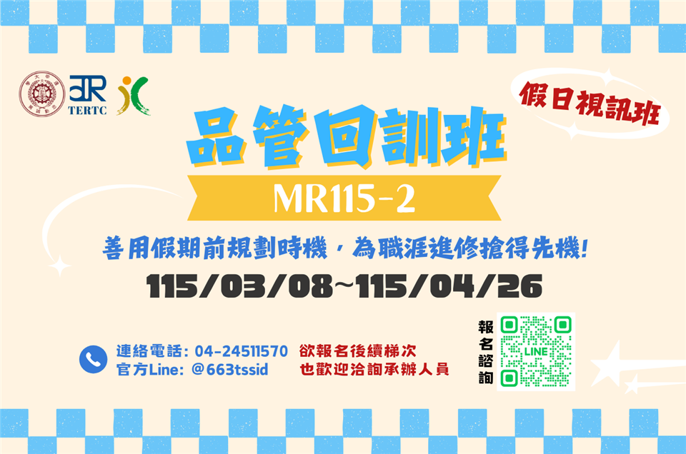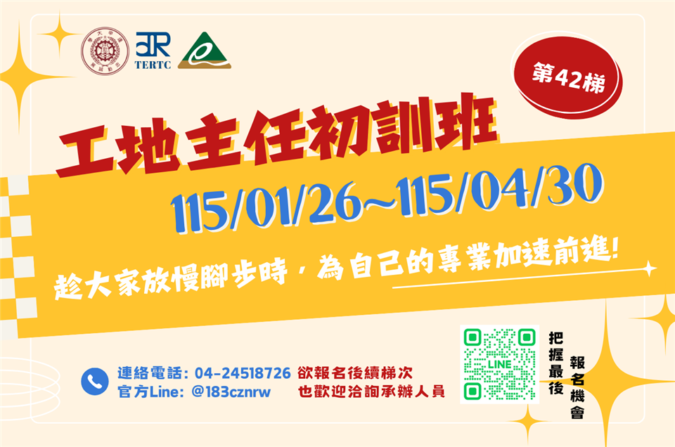 其他資訊 【轉知】逢甲大學-台灣工程研訓中心(TERTC)辦理職能訓練課程招生資訊 發布日期: 2026/01/13~2026/02/13 | 瀏覽人數: 15人 | 聯絡資訊: 張姳薇 04-8972001分機119 一、 工地主任班第42梯次初訓班,預定於115年1月26日開課,現尚有名額,敬請把握。二、 公共工程品質管理訓練班(班別:MR11502),預定於115年3月8日開課,名額有限,額滿為止。三、 報名方式(含附件)如下:(一) 加入本中心LINE官方帳號索取招生簡章及報名表:1、 工地主任班:@183cznrw2、 公共工程品質管理訓練班:@663tssid(二) 或電洽報名專線:1、 工地主任班:04-24517826。2、 公共工程品質管理訓練班:04-24511570。3、 中心辦公室 : 04-24517250分機3130。四、 上課地點:逢甲大學土木水利館或學思樓。