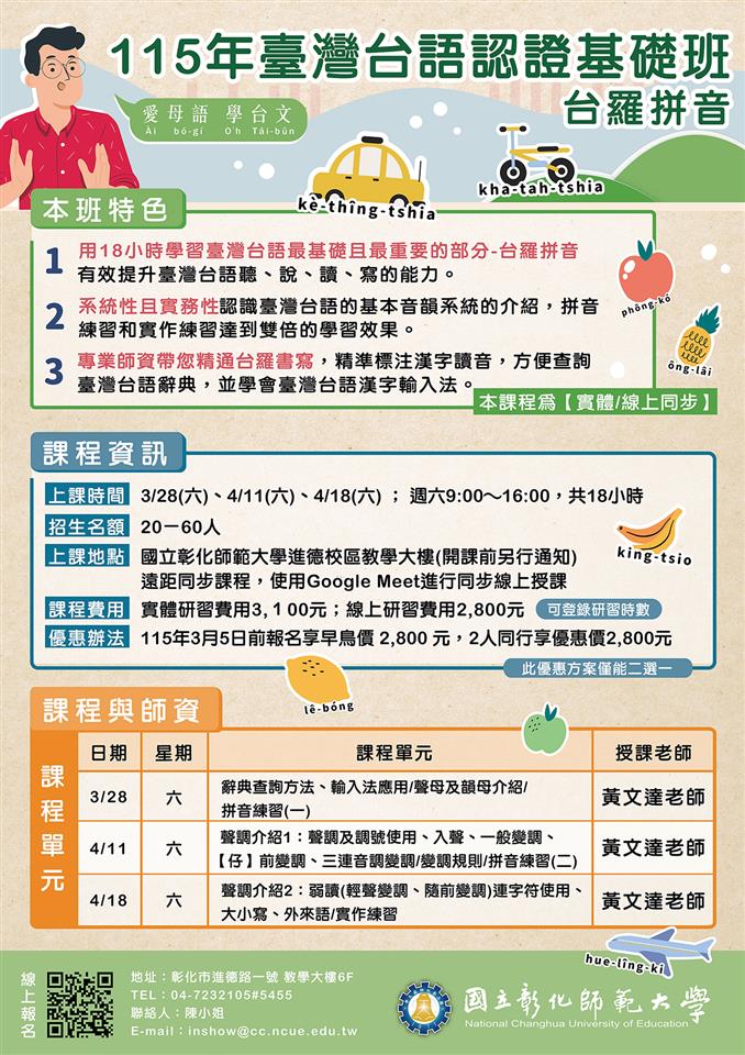 其他資訊 【轉知】國立彰化師範大學-進修學院推廣教育課程「115年臺灣台語認證基礎班-台羅拼音」、「115年臺灣台語能力認證考試輔導班」課程簡章 發布日期: 2026/01/29~2026/02/28 | 瀏覽人數: 10人 | 聯絡資訊: 張姳薇 04-8972001分機119 一、 「115年臺灣台語認證基礎班-台羅拼音」(一) 課程特色:用18小時學習臺灣台語-台羅拼音!由通過臺灣台語認證專業講師授課,系統性介紹臺灣台語的基本音韻系統,包括聲母、韻母、聲調與連讀音變,透過拼音和實作練習達到雙倍學習效果。(二) 課程時間:115年3月28日~115年4月18日,週六9:00~16:00,共計18時,公務人員及教師可登錄研習時數。(三) 課程費用:1、 實體課程:3,100 元。2、 線上課程:2,800 元。3、 3/5前報名享早鳥價 2,800 元,兩人以上同行每人享優惠2,800 元,此優惠方案僅能二選一。二、 「115年臺灣台語能力認證考試輔導班」(一) 課程特色:本班以通過教育部臺灣台語認證考試B2中高級為目標,聘請通過臺灣台語認證專業講師及各語文競賽評審,有效提升臺灣台語聽、說、讀、寫的能力。(二) 課程時間:115年4月25日~115年6月13日,週六 9:00~16:00,共計36時,公務人員及教師可登錄研習時數。(三) 課程費用:1、 實體課程:6,200元。2、 線上課程:5,800元。3、 3/31前報名享早鳥價5,800元,兩人以上同行每人享優惠5,800元,此優惠方案僅能二選一。三、 報名步驟:線上報名,請至本校進修學院報名管理系統報 名。如第一次報名, 請先申請帳號。(https://aps.ncue.edu.tw/cee/index.php)四、 請詳閱課程招生簡章,如有問題,請向本校進修學院進修教育研究中心洽詢:(04)723-2105分機5455陳小姐,Email:inshow@cc.ncue.edu.tw。